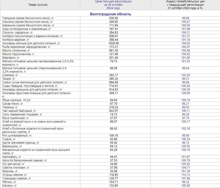 Волгоградстат поделился динамикой цен с 22 по 28 октября. Известно, что за неделю на 2,3% подешевела пшеничная мука, которая теперь продается по 37,57 рублей за килограмм. Также немного, на 1,8% подешевел сахар, который продают по 67,70 рублей за кг. При этом за неделю настоящий взлет цен показали свежие огурцы, которые подорожали на 12,1%, их продают по 118,95 за килограмм. «Серебро» заняли помидоры, подорожавшие на 7,5%, их в среднем можно найти по 120,77 рублей за кг. Еще 5,9% прибавил в цене репчатый лук, который лежит на прилавках по 35 рублей за килограмм. На 5% подорожали бананы и на 4,7% свекла, ее продают по 38 рублей за кг. 3,3% прибавила за неделю в цене сметана, которая стоит по 293,40 рубля за килограмм. Также немного подорожали хлебобулочные изделия из пшеничной муки и мясо кур. А вот цены на стоимость полета в салоне экономического класса самолета наоборот, упали на целых 6,2%. У нас есть закрытый телеграм-канал, там много интересного! Подписывайтесь Анна Анатольева