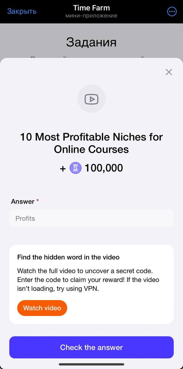 Видео-задания с кодами от Time Farm начали внедрять со вчерашнего дня. Первым видео в серии становится: «Top 10 Most Profitable Niches for Online Courses». Ответ: Profits 👈 Забираем халявные 100.000 Seconds и двигаемся дальше. P.S. Все коды к видео вы сможете находить на моем канале. VK l Teletype | Telegram