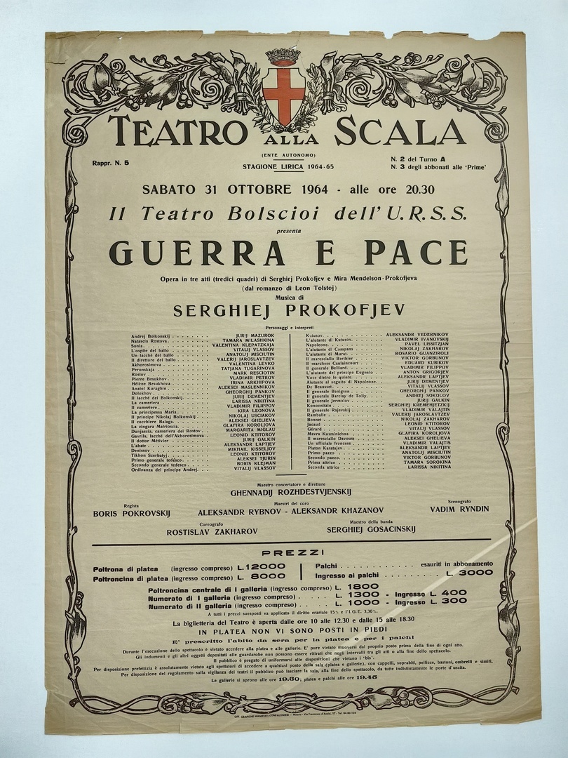 Большой театр представил на итальянской сцене спектакли «Борис Годунов», «Князь Игорь», «Пиковая дама», «Садко», «Война и мир». Публика знакомилась с русской оперной классикой. Общий успех гастролей был огромен. 31 октября 1964 г. состоялся показ оперы С. Прокофьева – "Война и мир", не только выдающейся по музыке, но и самой "многолюдной" во всем мировом оперном репертуаре. Такие грандиозные постановки под силу немногим театрам в мире. Главные партии исполняли: Наташа Ростова – Г. Вишневская, Андрей Болконский – Ю. Мазурок.