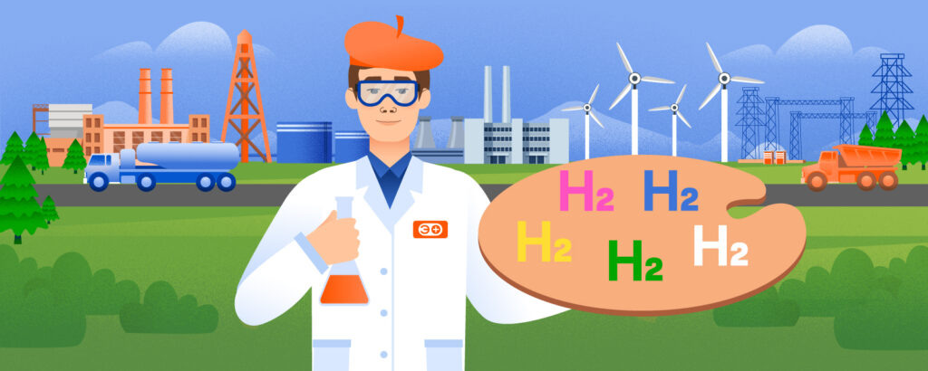 Представьте, что вы выбираете молоко в магазине. На витрине десятки разноцветных пакетов: в белой упаковке — фермерское, в синей — обычное пастеризованное, в зеленой — без лактозы. Цветовой маркировкой пользуются и в энергетике, когда говорят о водороде. Две абсолютно идентичные молекулы бесцветного газа H₂ могут быть «зелеными», «белыми», «изумрудными» — все зависит от способа их производства. Так называют водород, производство которого считается самым экологичным: его получают с помощью энергии возобновляемых источников — например, солнечных, ветровых и гидроэлектростанций. Воду расщепляют на водород и кислород методом электролиза. При таком способе не образуются парниковые газы. Это самый распространенный сегодня водород. Для его получения метан перерабатывают вместе с водяным паром методом паровой конверсии, при этом образуется углекислый газ. Доля серого водорода в энергетике по-прежнему велика из-за дешевизны его производства, но с ростом экологических стандартов его вытесняет га