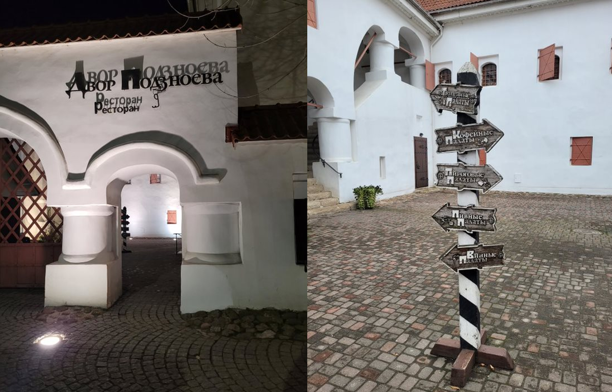 В палатах Поздноева 2 отеля, 3 ресторана и магазины. Во дворе стоит указатель со стрелками, но даже на финишной прямой, то есть лестнице, можно задуматься - налево? (Там "Пивные палаты") или всё же направо, в "Трапезные". Вывод для тех, кому лень читать. Главный ресторан города, ресторан ресторанович, место для всех торжественных отмечаний и обмываний. В антураж вложено много. И при этом есть вещи, которые мне не понравились, желания сюда часто ходить, вдруг окажись я в Пскове надолго, не возникнет. Один раз сюда надо обязательно, для галочки, но не влюбляет в себя - а в Пскове есть места, которые однозначно влюбляют! Ресторан не в подвале. Но темно. Причём не так темно, что тёмное помещение с пятнами света от ламп, а оно всё равномерно освещённое, но как-то слабо. Фотографии блюд все со вспышкой. Если план был напомнить, что в средние века окна были мутные и свет пропускали плохо, это замечательно, пусть окна будут мутные, но освещённости можно прибавить. Пивная карта ужасная. Позорн