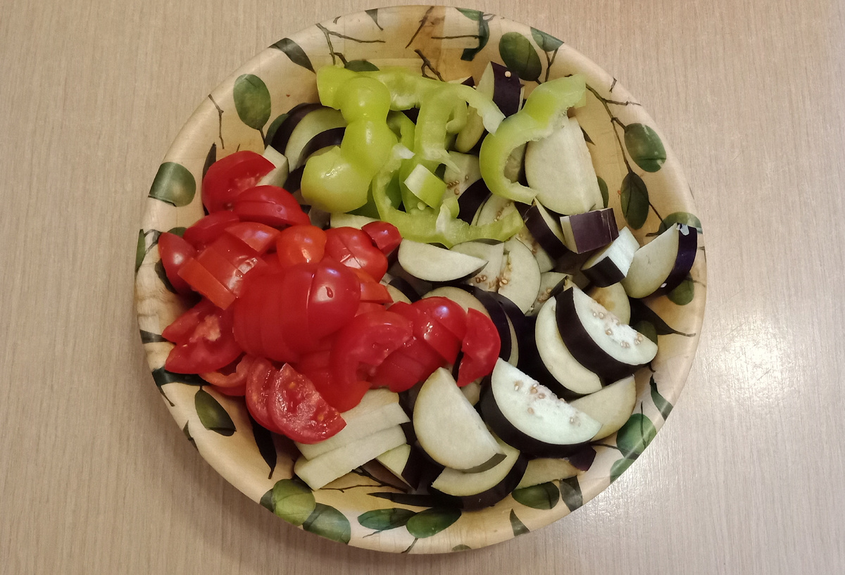 Ингредиенты: Мясо – 1 кг (любое которое вам нравится) Помидоры – 500 грамм Лук репчатый – 3 шт. среднего размера Перец болгарский или грунтовой – 2шт. Баклажаны – 1 шт. крупного размера Любая замороженная овощная смесь (у меня по-деревенски) – 400 грамм Чеснок – 5 зубчиков Томатная паста – 100 грамм Масло растительное – 100 мл. Соль – по вкусу Перец черный молотый – пол чайной ложки Кориандр молотый – пол чайной ложки Паприка молотая – 1 чайная ложка Вода - 3 литра Приготовление: Подготавливаем все ингредиенты, моем и очищаем от всего лишнего. Готовить можно в казане, в высокой кастрюле и т.п. Я готовлю в казане. Мясо нарезаем крупными кусочками (у меня свинина), лук, помидоры, баклажаны, перец нарезаем полукольцами. Чеснок мелко нарезаем. В казан наливаем 100 мл. растительного масла и как оно хорошо прогреется, выкладываем мясо. Обжариваем на сильном огне в течение 5-7 минут постоянно перемешивая (смотрим, чтобы не подгорало). Убавляем температуру до средних значений, далее добавля