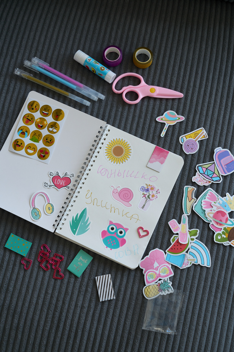 Создание совместных проектов с родителями или друзьями укрепляет связи и создаёт незабываемые воспоминания. Что входит в набор для творчества? Блокнот на 70 страниц, 3 ручки, брелок, наклейки на 4 листах, смайлики, 50 стикеров, скрепки-сердечки, ножницы, линейка и цветной скотч, позволяя проявить вашу фантазию