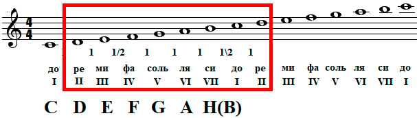 Итак, для того, чтобы привести гамму с тоникой D (ре) из "дорийского минорного" в "ионийское мажорное состояние", мы применили к ней "мажорный" алгоритм (2-тона/полутон/3-тона/полутон). Иными словами, мы взяли за основу ноту D (ре) в качестве тоники, распределили тоны и полутоны по нашей "мажорной" формуле, повысив III-ю и VII-ю ступени (отсчет ведем от ноты D (ре) - первой ноты внутри красной рамки!!!) получили те же "до-ре-ми-фа-соль-ля-си", только как бы окрашенные в другой цвет: