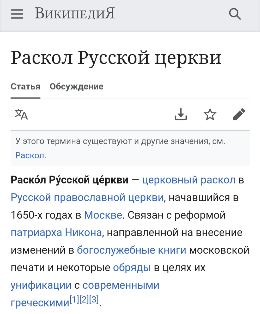 «…всякое царство, разделившееся само в себе, опустеет; и всякий город или дом, разделившийся сам в себе, не устоит» Матфей 12:25 Все мы помним о таком величайшем событии в истории нашего государства, как Раскол Русской Православной Церкви, который произошел в середине XVII века и начался в Москве. Этот раскол был связан с реформой, проводимой патриархом Никоном. Направлена она была на унификацию обрядов с современными греческими и соответственно, требовала внесения изменений в богослужебные книги московской печати. Ниже скриншот об этом из Википедии и ссылка. Если коротко охарактеризовать широко распространённое традиционное понимание этого церковного раскола, то большинство из нас имеют о нем представление, как о споре – как нужно правильно делать крёстное знамение. Двумя перстами или тремя. Но на самом деле причина раскола была совсем в другом. Все мы помним из той же истории, что на Руси существовала берестяная грамота. Анализ находимых в Великом Новгороде берестяных грамот показал,