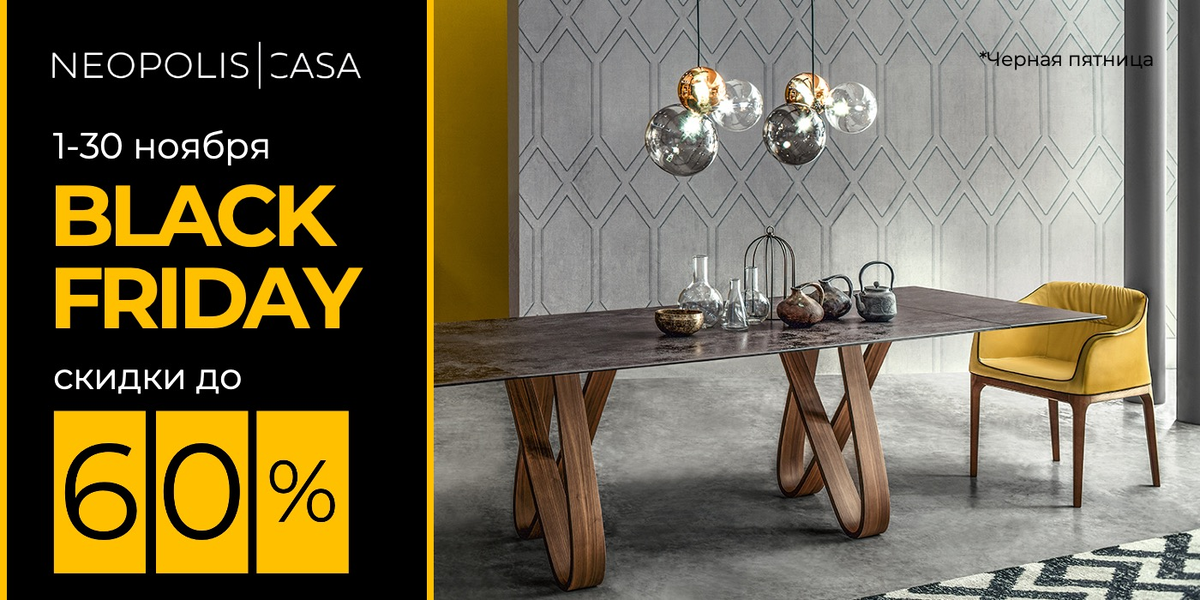 Не упустите момент сделать свой дом по-настоящему уютным! В эти дни в Neopolis Casa вас ждут невероятные скидки на дизайнерскую мебель из Италии и Испании. Мы устраиваем грандиозную распродажу с 1 по 30 ноября включительно. Огромное пополнение раздела «Распродажа» со скидками до 60%! И в честь «Черной пятницы» — еще +10% дополнительной скидки ко всем товарам из раздела «Распродажа»! Погрузитесь в атмосферу европейского стиля и уюта с Neopolis Casa и оформите пространство своей мечты. Ваша мебель — ваша история, напишите ее с нами!