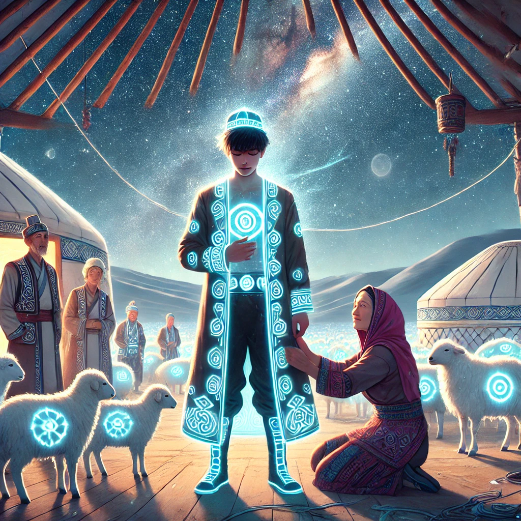 Арстан стоял на пороге юрты, оглядывая бескрайние просторы космоса, простиравшиеся перед ним. Его традиционный чапан, изготовленный из наноматериалов, мягко светился в свете далёких звёзд. На поясе висел комуз — не просто музыкальный инструмент, а высокотехнологичное устройство, способное влиять на энергетические поля.
