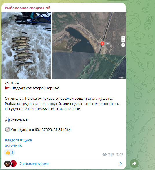 Для всех, кого заинтересовала рыбалка зимой в Ленинградской области, подготовил статью про топ 5 лучших мест ловли в это непростое время. Читайте материал до конца и узнаете где лучше всего клюёт со льда и как вообще туда добраться. Эта информация поможет поймать самим. 1) Ладожское озеро, губа Чёрная Сатама, в народе просто Чёрное по одноименной деревне рядом. Это классика для открытия зимнего сезона в Ленинградской области. В бухте Черная возле деревни лёд встает одним из первых на Ладоге, также здесь есть мост через Новоладожский канал. Дело в том, что в других местах перейти канал далеко не всегда можно, в том время как на Ладоге уже достаточно крепкий лёд. Поэтому эта локация самая доступная, да и окунь тут есть, в основном все приезжают именно за ним. Но не только окунем богаты эти места, на жерлицы также неплохо ловят щуку. У большинства Чёрное ассоциируется с началом сезона, однако ловится тут всю зиму до последнего льда. Особенно интересно, когда встанет вся губа и открываетс