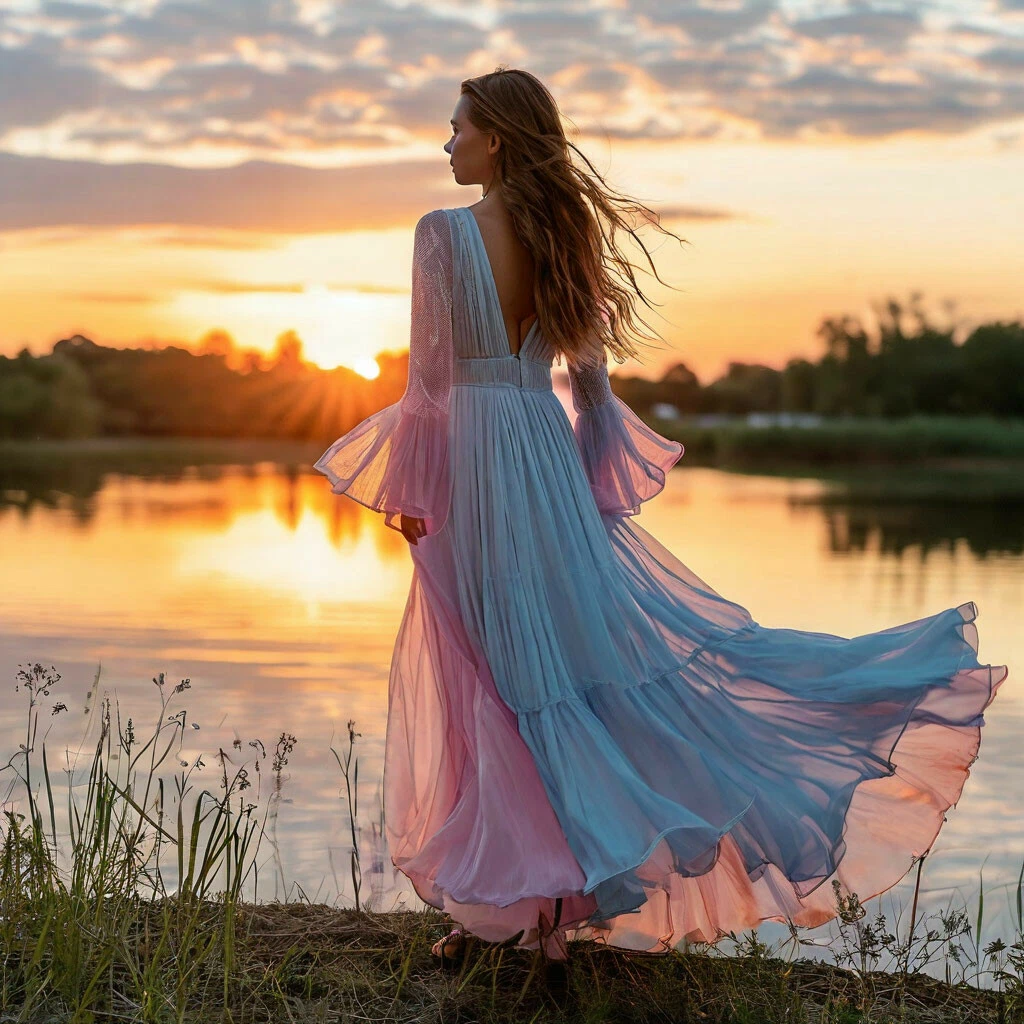 Солнце нежно целовало реку, превращая воду в расплавленное золото, окрашивая небо в романтичные розово-голубые тона. Яна стояла на берегу реки в длинном шифоновом платье цвета закатного неба.