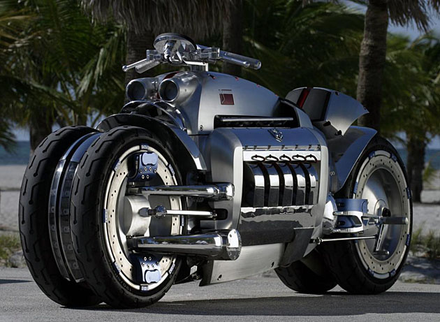 Dodge Tomahawk — это мотоцикл, больше напоминающий научно-фантастическое транспортное средство, чем обычный байк. Этот уникальный мотоцикл был представлен на Североамериканском автосалоне в 2003 году, и его главной особенностью стал 10-цилиндровый двигатель, взятый от Dodge Viper. Из-за своей экстремальной скорости и нестандартного дизайна, мотоцикл так и не стал серийным.