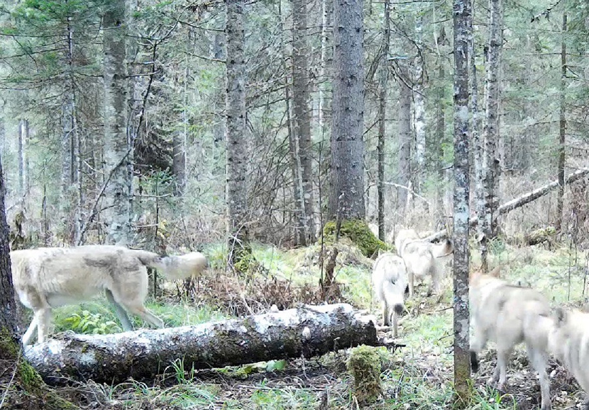 В нацпарке «Шушенский бор» на юге Красноярского края в фотоловушку попала стая из восьми волков. На видео животные идут один за другим и скрываются в лесу. Как отметили в парке, это самая крупная стаю, которую удалось заснять за весь период наблюдений в парке. Волк в «Шушенском бору» — обычный вид. Это зверь средних размеров, обладающий большой силой. У него развиты органы чувств — слух, зрение, обоняние. Специалисты считают, что основную информацию волки получают через слух и уточняют её зрением. Этот вид — один из ключевых в поддержании баланса экосистемы, так как регулируют численность других видов. Как отметил младший научный сотрудник парка Андрей Сарапу, обычно численность семейной волчьей стаи составляет около пяти особей, стая из восьми волков считается крупной. Волки моногамны и образуют пары до гибели одного из супругов, живут в стае. Основу семьи составляет волчица. фото: нацпарк «Шушенский бор»