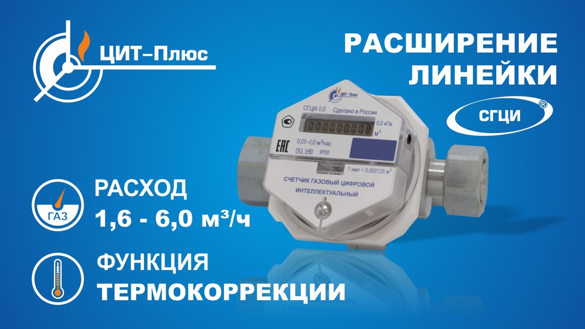 Уважаемые коллеги и партнеры! Рады сообщить вам, что мы приступаем к производству счетчиков газа СГЦИ с термокоррекцией! Такие счетчики газа целесообразно применять в случае произведения измерений при температуре, отличающейся от комнатной. В этом случае данные по объему газа, прошедшему через счетчик, будут скорректированы с учетом температурного расширения газа. Это позволит потребителю платить только за фактически потребленный газ в независимости от сезонной температуры газа. Счетчики СГЦИ® с термокоррекцией будут доступны во всех выпускаемых модификациях (по расходу газа, диаметру и типу присоединения к трубопроводу). Еще одна отличная новость: старт производства счетчиков СГЦИ с расходом 6.0 м³/ч! Теперь компания «ЦИТ-Плюс» готова предложить потребителю полную линейку счетчиков газопотребления для бытового применения: 1,6; 2,5; 3,2; 4,0; 6,0 м³/ч. Подробнее ознакомиться с информацией о счетчиках СГЦИ, скачать руководство по эксплуатации вы можете по данной ссылке