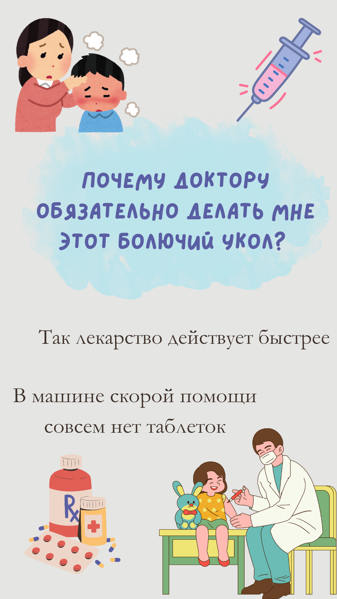 Существует множество вкусных сиропов, которые дают родители. Иногда они дают и лекарства в форме таблеток, которые не такие приятные на вкус, но все равно лучше уколов. А вот если приходит доктор, он обязательно делает инъекцию. Почему так происходит? Это связано с тем, что врача вызывают тогда, когда сиропы и таблетки не оказывают нужного эффекта. Инъекция может содержать то же вещество, что и сироп, но оно попадает непосредственно в кровь, если делается внутривенно, или в мышцу, если делается в ягодицу. В любом случае, оно подействует гораздо быстрее, чем выпитый тобой сироп или проглоченная таблетка. Кроме того, в шприце может быть другое вещество, которое родители не смогут дать ребёнку принять внутрь. Ещё одна причина — у врачей в машине скорой помощи нет таблеток, поэтому они могут сделать только инъекцию. Врачи не хотят причинять боль, их цель — помочь и вылечить. Будь умничкой и потерпи немного, после инъекции тебе обязательно станет легче.