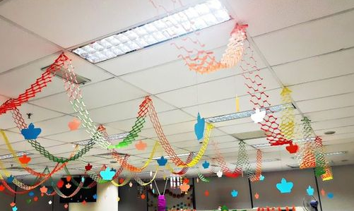 Вынесу на верх главный принцип украшения потолка Армстронг. Так будет понятнее как украсить подвесной потолок, а главное - чем. Да, тут надо согласиться, каркас потолка с его металлическими решётками манят просто подвесить на нём украшения: это просто, а главное, место удачное, пусть висят и радуют глаз. Но! Всегда есть маленькое "но". Главный принцип при декорировании, украшении потолка Армстронг: Не перегружать подвесную систему!!! Соблюдать технику безопасности и не нарушать требования эксплуатации подвесных потолков. Подвесной потолок Армстронг - это конструкция из металлического каркаса и плит заполнителей. Обычно, панели для потолка в офисах - это минеральные плиты, достаточно лёгкие, которые без труда приподнимаются в ячейке каркаса. Это как раз и делает возможным и привлекательным потолочное пространство для украшений. Приподняли панель, привязали, зацепили чем-то или скотчем приклеили украшение и готово. Висит, всех радует. Потолочные панели не следует использовать как место