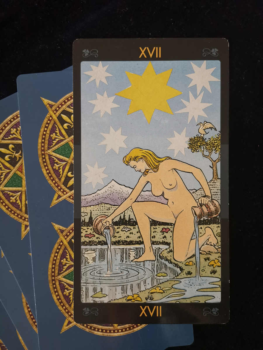 Эта карта тихо шепчет что всё будет хорошо. Вновь обретённая надежда и вера. Большинство колод следует иконографии Марсельской колоды и Райдера и изображают на этой карте обнажённую женщину, стоящую на одном колене и льющую воду из двух сосудов: из одного на землю, из другого - в воду. В ясном небе сияют звёзды, а на дереве, что на заднем плане, зачастую сидит птичка. Главная звезда имеет восемь лучей - так повелось ещё с колоды Висконти. Восьмиконечная звезда - вечный дар, сияющий с небес напоминанием о свете Божественном, символизирует постоянное присутствие духа в обыденности. В "Умеренности" ангел переливают воду из одного сосуда в другой. "Звезда" ничего не оставляет себе и, кроме того, не стоит, а милостиво встаёт на колено. И ещё она - человек, а не ангельский идеал. Ибо если мы хотим трансформировать себя - делать это нужно не только через сознание, но и через тело. Золотая Заря отдала этой карте зодиакальный знак Водолея, превратив её тем самым в символ новой эпохи или эона