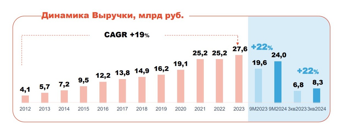 Группа компаний МД Медикал (Мать и Дитя) опубликовала операционные и финансовые результаты за 3 кв. и за девять месяцев 2024 года. За 9 мес. количество принятых родов увеличилось на 13,8% г/г, количество посещений на 17,9% г/г, койко-дней на 4,8%, пункций ЭКО на 3,5%. Если смотреть показатели последнего квартала относительно того же периода прошлого года, то по всем ключевым показателям динамика чуть скромнее. Выручка по итогам 9 мес. текущего года выросла на 22,3% г/г – до 24 млрд.руб. Сопоставимая выручка (LFL) выросла на 18,9%. Компания продолжает расширять свои площади. Компания открыла клинику в Челябинске, общей площадью 420 кв. м., клинику в Липецке общей площадью 450 кв. м и медицинский центр в Анапе общей площадью 2754 кв. м. Также был открыт медицинский центр в Москва-Сити общей площадью 1460 кв. м и клиника «Мать и дитя» Солнцево общей площадью 175 кв. м. Прозвучали заявления, что компания может уже третий раз в этом году выплатить дивиденды. По итогам третье