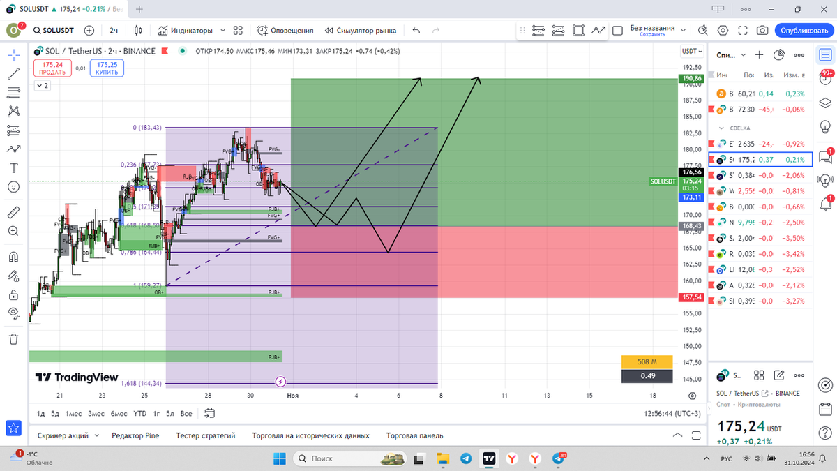 По солане отлично получили реакцию на покупке в районе 164 и поднялись на 181 На данный момент жду коррекцию либо в 0.618 по фибо либо в 0.5 где и буду заходить в лонг и держать до 190-200 Ниже считаю не опустимся просто по тому что в данных реалиях это не логично и к тому же сформированный RJB вместе с OB дают нам понять о повышенном интересе на актив Переходи ко мне в телеграмм канал если хочешь больше информации https://t.me/GiveYouMonney Торгую на бирже BingX https://bingx.com/invite/PWBGPX/