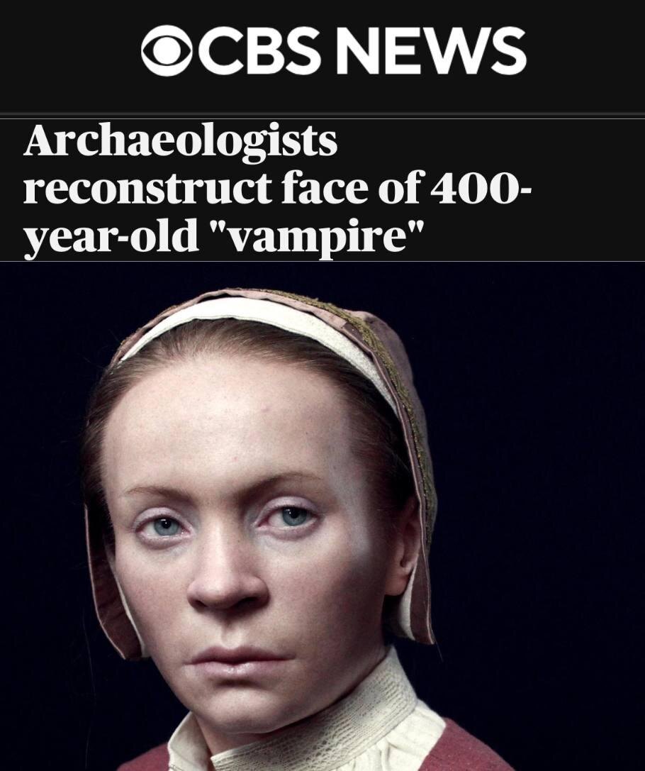«Археологи воссоздали лицо 400-летней «вампирши», похороненной с железным серпом на шее»: Ученые «воскресили» женщину, которую современники хотели похоронить навсегда. «Два года назад археологи в Польше сделали удивительное открытие — останки с серпом на шее и замком на ноге. 400-летняя женщина, найденная на кладбище в деревне Пьен, считалась вампиром, и те, кто ее хоронил поставили ей поперек горла серп, чтобы помешать восстать из мертвых. Ученые использовали ДНК, 3D-печать и глину, чтобы реконструировать лицо Зоси, как ее прозвали местные жители. «Это действительно иронично, — сказал археолог Оскар Нильссон. — Люди, хоронившие ее, сделали все возможное, чтобы помешать ей восстать из мертвых... мы же сделали все, чтобы вернуть ее к жизни». В деревне сохранились предания о Зосе — сначала она была похоронена только с замком, но когда жители начали испытывать необъяснимое невезение, то решили вскрыть могилу, где с ужасом увидели, что замок открыт. Тогда селяне в большой панике пристави