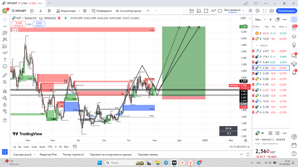 По вифу ожидаю рост до 4.5 На данный момент ожидаю коррекцию где и буду заходить 3 лимитными ордерами С низу мы сформировали хорошую зону поддержки 2.4-2.2 вряд ли цена пробьет эти уровни у уйдет ниже (данный сценарий будет говорить нам о смене тренда и падении интереса на актив) Переходи ко мне в телеграмм канал если хочешь больше информации https://t.me/GiveYouMonney Торгую на бирже BingX https://bingx.com/invite/PWBGPX/
