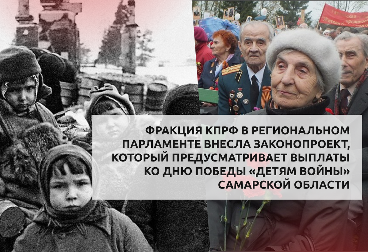 С 2014 года КПРФ настаивает, чтобы выплаты установили всем «детям войны» без исключения. Данный законопроект предусматривает осуществление ежегодной денежной выплаты ко Дню Победы всем гражданам России, постоянно проживающим на территории Самарской области, родившимся на территории СССР в период с 3 сентября 1927 года по 3 сентября 1945 года включительно, БЕЗ УЧЁТА так называемого критерия нуждаемости, предусмотренного в настоящее время действующим Законом.
