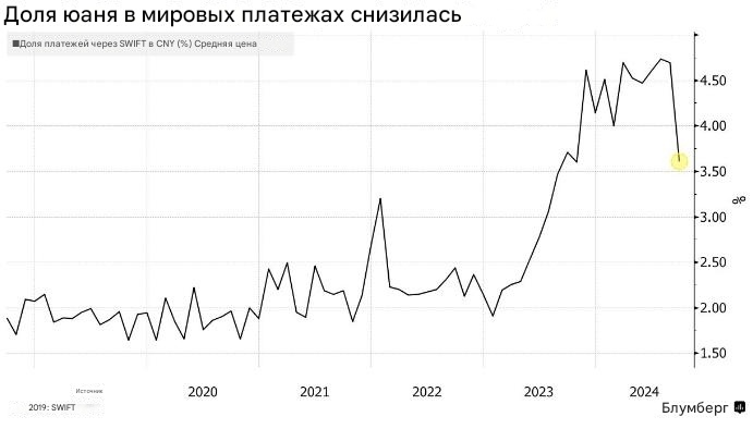 Это случилось на фоне укрепления валютного курса По данным международной системы финансовых сообщений SWIFT, в прошлом месяце доля транзакций с использованием юаня в мировых платежах достигла рекордно низкого уровня. Она составила 3,6%, что на 1,1 процентных пункта меньше, чем в предыдущем месяце. В 2010 году этот показатель был ещё ниже — 2,5%. Аналитики пока не могут точно определить причину спада. Некоторые эксперты связывают его с ослаблением юаня, который находился под давлением в первой половине года. Однако в сентябре курс валюты начал укрепляться третий месяц подряд и ненадолго достиг отметки 7 за доллар. Это произошло на фоне улучшения настроений инвесторов в отношении экономики Китая после серии мер стимулирования для ускорения роста. «После того как давление на юань снизилось, компании могут потерять мотивацию использовать местную валюту в расчётах и начать активнее использовать свои долларовые активы», — считает Кен Чунг, главный азиатский валютный стратег в Mizuho Bank. «Т