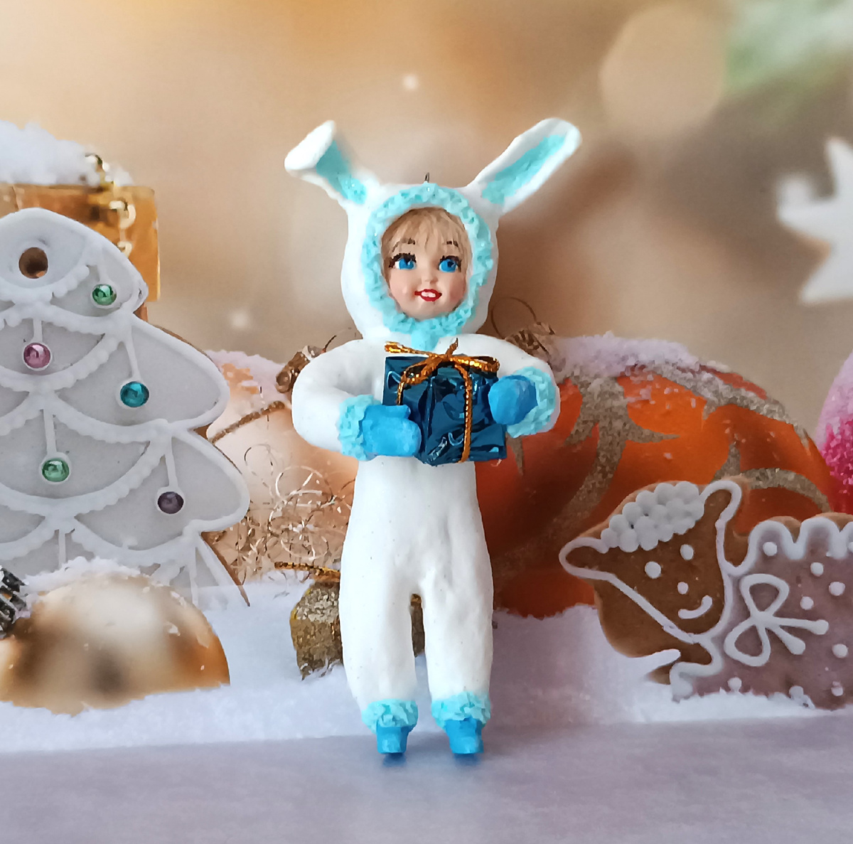 Доброго всем дня! Мой новый Зайка - малышок в карнавальном костюме с подарочком. Пополняется хоровод моих куколок под ёлочку))). Я не стала снимать подробные процессы скручивания каркаса и намотки слоев ваты - они стандартные, как и для всех игрушек. Тем более, что Зайка прост в исполнении, в процессе использовалась только белая вата и немного голубой окрашенной. Главное - вывести фигурку с ручками, ножками и попой: Ручки тоже ватные, в отличие от моих предыдущих куколок, где я использовала отлитые из гипса ладошки. У Зайки гипсовые лишь ботиночки, а варежки слеплены из ваты: Также новым был для меня вариант создания челки из волокон джутового шнура. Выглядит неплохо, более правдоподобно, нежели нитки мулине))). В ручках Зайка держит подарочек, полученный от Деда Мороза: В завершение, после просушки всей композиции покрываем Зайку акриловым лаком с глиттером: В двух-трех видео-МК покажу процесс создания челочки, вывод ушек и хвостика и завершающее украшение костюма. Добро пожаловать к