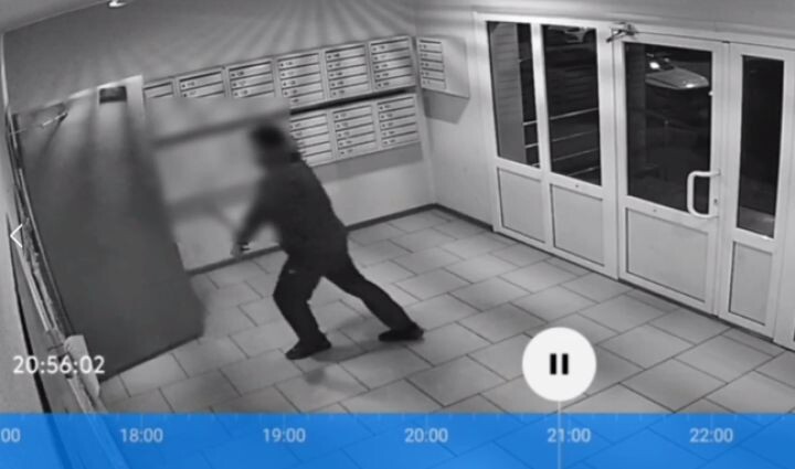 На ролике видно, как еле стоящий на ногах гражданин пытается открыть дверь и, вероятно, разговаривает с невидимым другом — даже улыбается ему. Вскоре мужчина находит нужный ключ и агрессивно открывает дверь. Он заходит внутрь, крепко сжимая нож перед собой, будто готовясь вступить в схватку с незримым противником.