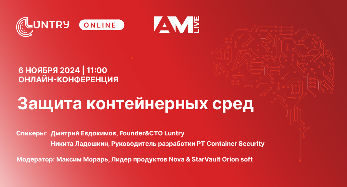 6 ноября в 11:00 состоится онлайн-конференция AM Live “Защита контейнерных сред”. Дмитрий Евдокимов, основатель и технический директор Luntry, примет участие в трансляции и вместе с другими спикерами обсудит риски и средства защиты контейнерных сред. Во время онлайн-конференции разберем: Зарегистрироваться на конференцию можно по ссылке.
