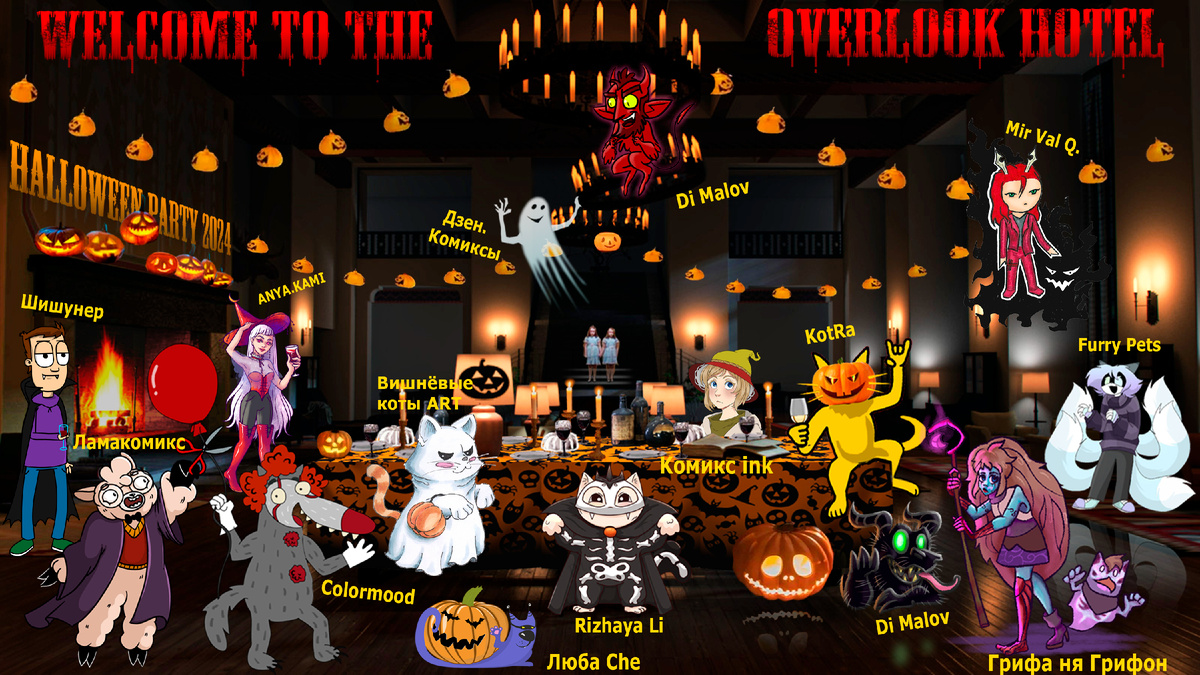Сегодня 31 октября, поздравляю всех с Хэллоуином и Тыквенным Спасом! Неделю назад на канале KotRa наткнулась на набор желающих поучаствовать в коллабе. Для меня это первый опыт участия в коллаборации, было волнительно, но все прошло хорошо) Местом встречи стал холл отеля "Оверлук" из фильма Стенли Кубрика "Сияние". Как видите, на празднике жизни или смерти собрались разные персонажи, каждый нарядился как сумел) Думаю, моего котика, прикинувшегося призраком, вы уже заметили) Давайте же посмотрим на остальных гостей поближе! 🎃✨🎃✨🎃✨🎃✨🎃✨ На этом гости вечеринки с вами прощаются, жутчайшего вам праздника!!!))