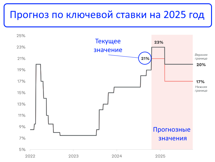 Риторика ЦБ предполагает возможное увеличение ставки на следующем заседании 20 декабря вплоть до 23% и сохранения высоких ставок как минимум еще на год. В 2025 году прогнозный диапазон ставок составляет 17-20%.