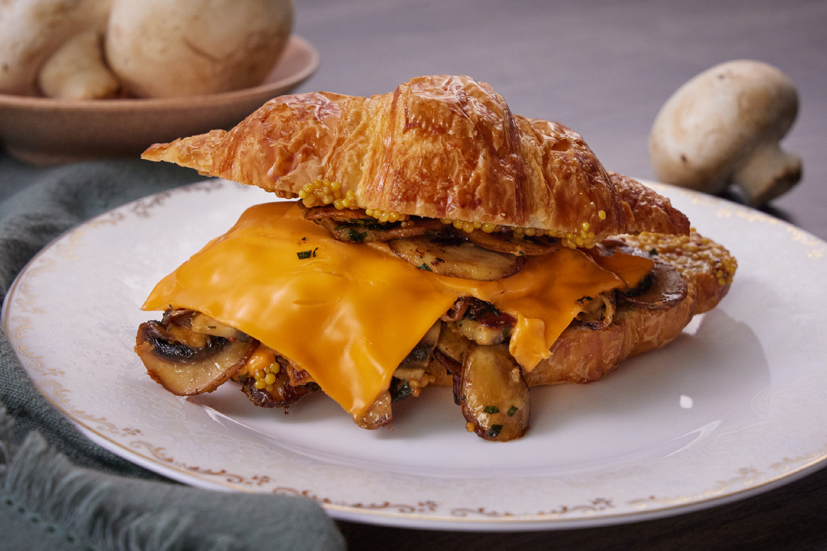 Ингредиенты: Круассан «Классический» большой 1 шт. Шампиньоны 70 г Сыр плавленый для чизбургера 3 слайса Чеснок 1 зубчик Зернистая горчица 2 ч. ложки Петрушка 10 г Подсолнечное масло 20 мл Соль, перец Приготовление: 1. На разогретую сковороду налить 20 мл подсолнечного масла и отправить тонкие слайсы чеснока. 2. Шампиньоны нарезать крупными тонкими ломтиками и отправить в чесночное масло на сковороду, посолить и поперчить по вкусу. Грибы обжарить в течение 3 минут до золотистого цвета на сильном огне. 3. Листики петрушки мелко нарезать и отправить к грибам в конце обжаривания, убавить нагрев и все ингредиенты собрать в небольшую горку в центр сковороды. 4. Положить на грибы с петрушкой слайсы сыра, накрыть крышкой и дать сыру расплавиться. Совет от шефа: «Лучше взять слегка подсохший круассан, его легче разрезать без деформации». 5. Круассан разрезать пополам и смазать срезы у обеих половинок зернистой горчицей (по 1 ч. ложке). Переложить на нижнюю половину круассана грибы с распл