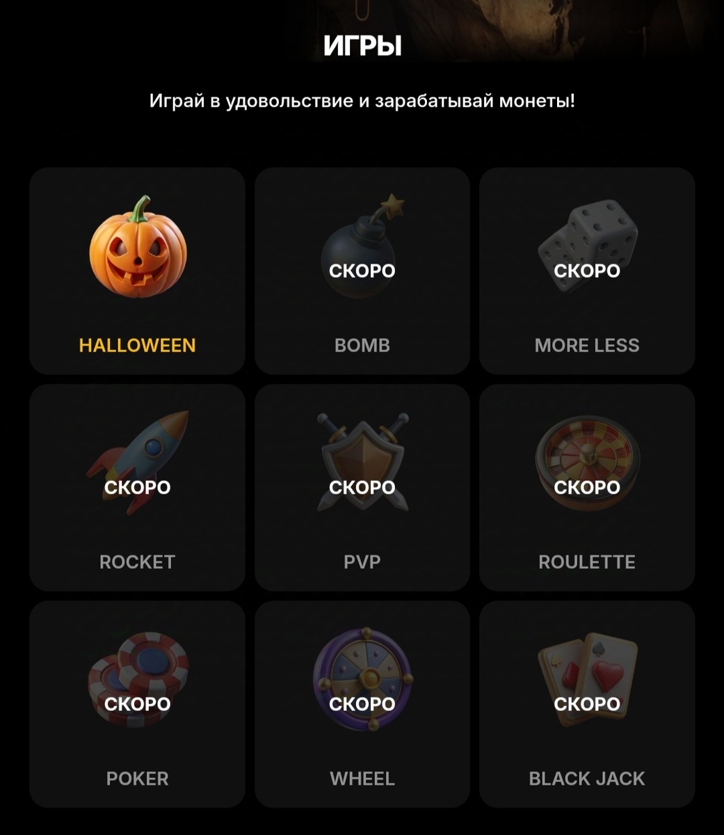 В Goblin Mine Game появилась первая игра! В самом низу слева есть вкладка ИГРЫ. Эта вкладка пока не подсвечена, а рядом стоит надпись: СКОРО БУДЕТ. Не обращаем внимание на эту надпись и нажимаем на иконку, удерживая палец 5-10 секунд. После этого мы попадаем в раздел ИГРЫ и видим, что одна игра Halloween уже доступна - это такая хэллоуинская оранжевая тыковка. Остальные игры пока недоступны, они не подсвечены, присутствует надпись СКОРО. Прочитать названия игр уже можно: Roulette, Poker, Wheel. Black Jack – это, судя по названиям, будут азартные игры, а также Bomb, More Less, Rocket, PVP. Скорее всего это будут несложные игры, в которых нужно будет выполнять какие-то задания. Итак, переходим к нашей игре. После нажатия на иконку мы попадаем к гоблину с колесом фортуны в руках. В день можно сделать только одно вращение и получить приз. Призы разнообразные: можно выиграть TON – от 0,1 до 5, бронзовые монеты от 50К до 2М, а также серебро – 50К и 100К. Хочу отметить, что никакой рекламы