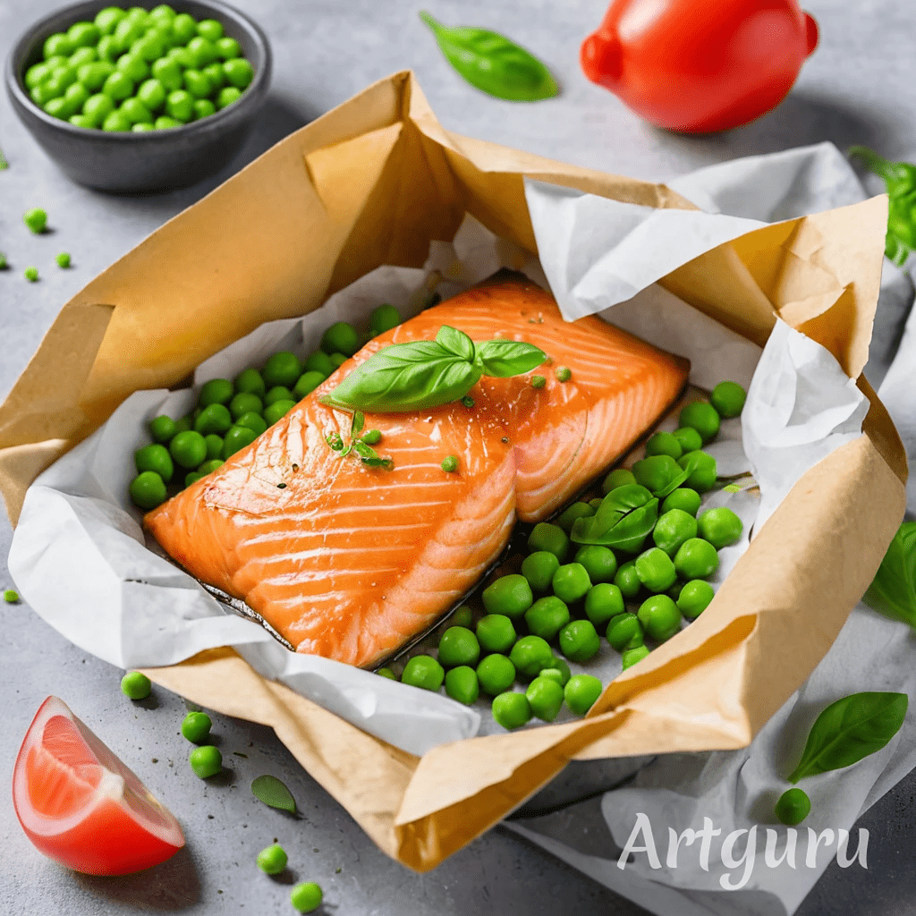 Семга, запеченная в пергаменте с зеленым горошком, базиликом и микрозеленью