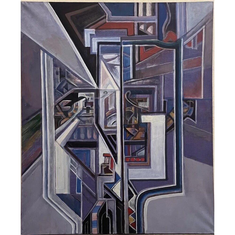 Архитектурная сложность и метафорическая битва Картина "Противостояние" захватывает своей архитектурной сложностью и геометрической мощью. В её лабиринте форм и линий словно разворачивается скрытая битва — не физическая, а метафорическая, где каждая линия олицетворяет столкновение различных сил и идей. Столкновение структур и нескончаемая борьба Переплетающиеся прямоугольники, треугольники и изогнутые элементы создают впечатление столкновения структур, будто они ведут нескончаемую борьбу за доминирование в ограниченном пространстве. Холодная цветовая гамма и внутреннее напряжение Цветовая гамма, с оттенками синего, серого и фиолетового, хотя и холодная, усиливает ощущение внутреннего напряжения. Она напоминает конфликт высокотехнологичного мира с человеческими эмоциями, где холодная логика сталкивается с мягкими, но мощными силами интуиции и хаоса. Символика внутренних и внешних конфликтов Возможно, эта работа заставляет задуматься о противостояниях, с которыми каждый сталкивается: лог