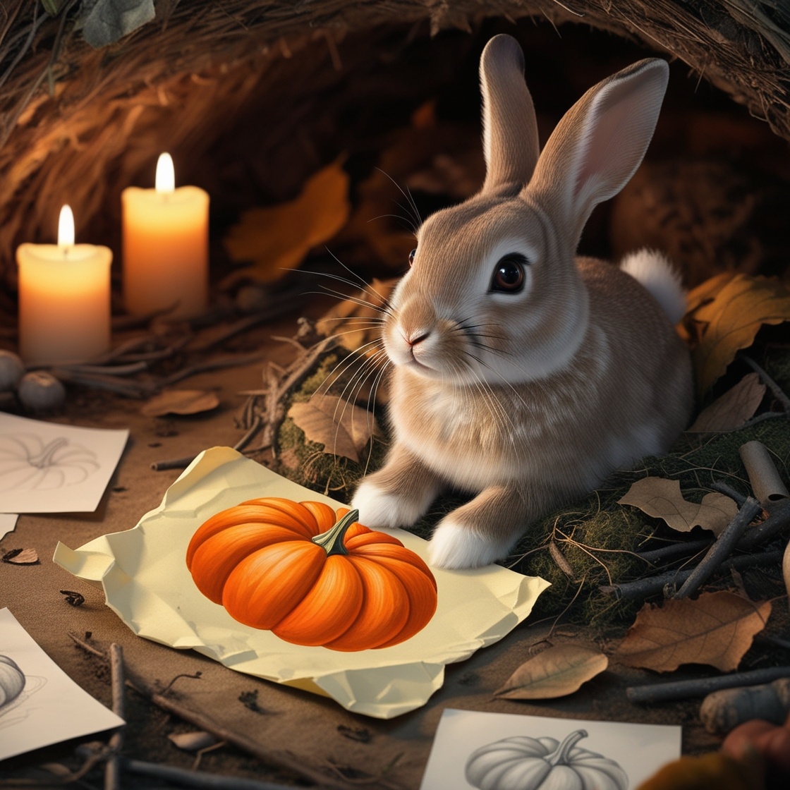 Кролик Кувырок уютно устроился у входа своего домика на краю Волшебного Леса, с интересом рассматривая осенние листья, которые уже меняли цвет на золотистый. Пришла осень, приближался удивительный праздник — Хэллоуин! Кувырок слышал от своих друзей, что в эту ночь происходит что-то необычное и немного страшное, но в то же время волшебное. Кувырок зашёл в кладовку и начал готовиться. Ему хотелось сделать что-то особенное! «Нужно нарисовать тыкву!», — подумал он. Кувырок достал оранжевую краску и кисть. Он всегда любил рисовать, и поэтому с радостью взялся за создание тыквы. Вскоре на листе бумаги появилась тыква с веселой улыбкой и большими блестящими глазами. Она выглядела очень мило! И когда его друг Прыгунчик заглянул к нему в гости, он воскликнул: — Ух ты! Какая чудесная тыква! — Он прыгает, как всегда, полон энергии и счастья. — Не хочешь, чтобы я тоже нарисовал свою? — Конечно, Прыгунчик! — с радостью ответил Кувырок. — Давай сделаем нашу тыквенную выставку! Прыгунчик притащил с с