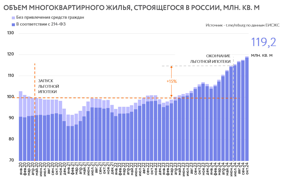 Через 4 месяца после сворачивания массовой льготной ипотеки, на фоне значительного падения объема продаж и проблем с лимитами по семейной ипотеке, объем жилья в стадии строительства продолжает расти. В конце октября в работе находилось 119,9 млн. кв. м жилья. Это на 1,3% больше предыдущего месяца и на 12% больше чем в октябре прошлого года. Показатель растет по всем федеральным округам за исключением Северо-Западного. Северо-Западный федеральный округ – единственная территория, где объем текущего строительства за последние 4 года снизился. Развитый рынок жилья с большим объемом строительства в СЗФО сформирован лишь в Санкт-Петербурге (6 млн. кв. м) с Ленинградской областью (4 млн. кв. м) и в Калининградской области (1,6 млн. кв. м). Заметные показатели в Архангельской (0,66 млн кв. м) и в Вологодской (0,66 млн кв. м) областях. Снижение показателя по округу определено стабильным падением объемов строительства в Санкт-Петербурге. В конце 2019 года здесь в стадии строительства находилось
