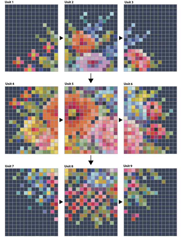 Добрый день, дорогие друзья и любители лоскутного шитья. Посмотрите на эту схему. Что она вам напоминает? Уверена, многие скажут, что это похоже на схему вышивки. Ан нет! Такие раскладки используют дизайнеры, чтобы собрать квилты удивительной красоты! Эти одеяла сшиты из квадратиков одинакового размера. Стачивая их вместе в полоски, один за одним, мастер затем собирает из получившихся полосок восхитительные картины. Эта техника называется "акварельный квилт", иногда ее называют "пиксельное одеяло". Считается, что это одна из простых техник, и она не требует особенного швейного мастерства. Но я не согласна! Дело не в том, что надо суметь безошибочно состыковать около 2 500 квадратиков, чтобы собрать такой лоскутный топ. Меня восхищает терпение, выдержка и упорство авторов подобных работ. Вы только представьте себе, сколько времени понадобится, чтобы подобрать лоскутки всех нужных цветов! В этой работе их 46. Затем их нарезают, предварительно пронумеровав каждый оттенок, чтобы сопостав