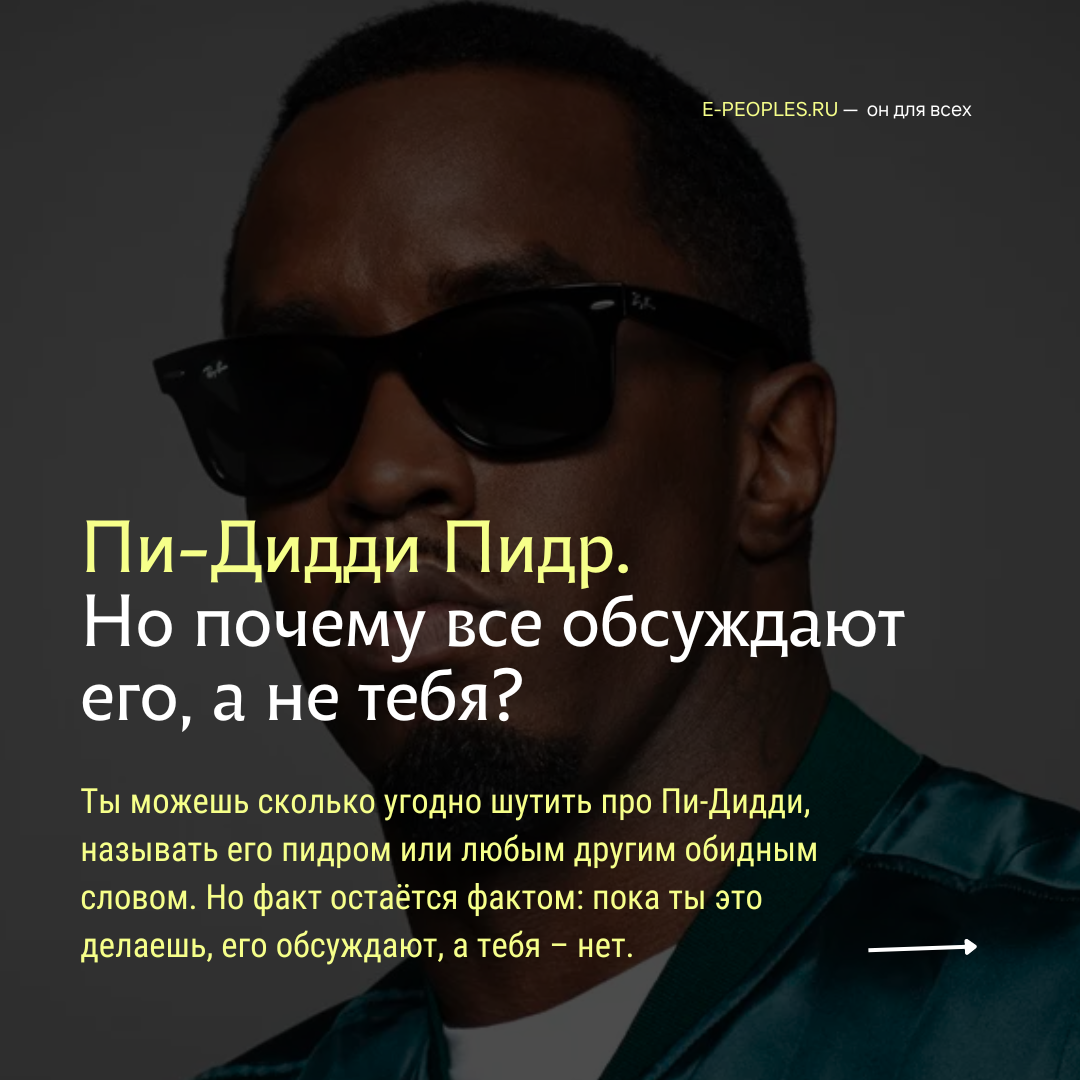 Все обсуждают Пи-Дидди, а не тебя? Узнай секреты его успеха, как создать свой личный бренд, развивать соцсети и создать спрос на твои продукты или услуги. Ты можешь сколько угодно шутить про Пи-Дидди(P. Diddy) , называть его пидром или любым другим обидным словом. Но факт остаётся фактом: пока ты это делаешь, его обсуждают, а тебя – нет. Почему так? Что он делает правильно, а ты – нет? Давай разберёмся и возьмём несколько уроков у того самого Пи-Дидди(P. Diddy). Вот как он делает так, что его имя всегда на слуху. Хотите, чтобы ваш личный бренд был на слуху, приносил прибыль и поток клиентов? Мы создадим это для вас! Упакуем и оформим ваш бренд так, что о нём будут говорить. Разработаем стратегию продвижения, создадим персональную страницу и мощный продающий сайт, а наш отдел продаж начнёт приводить вам клиентов за процент от продаж. Всё, что вам нужно — просто оставить заявку на E-PEOPLES.RU. Начните зарабатывать на своём бренде уже сейчас! 1. Легенда Личного Бренда Тебя вспоминают, к