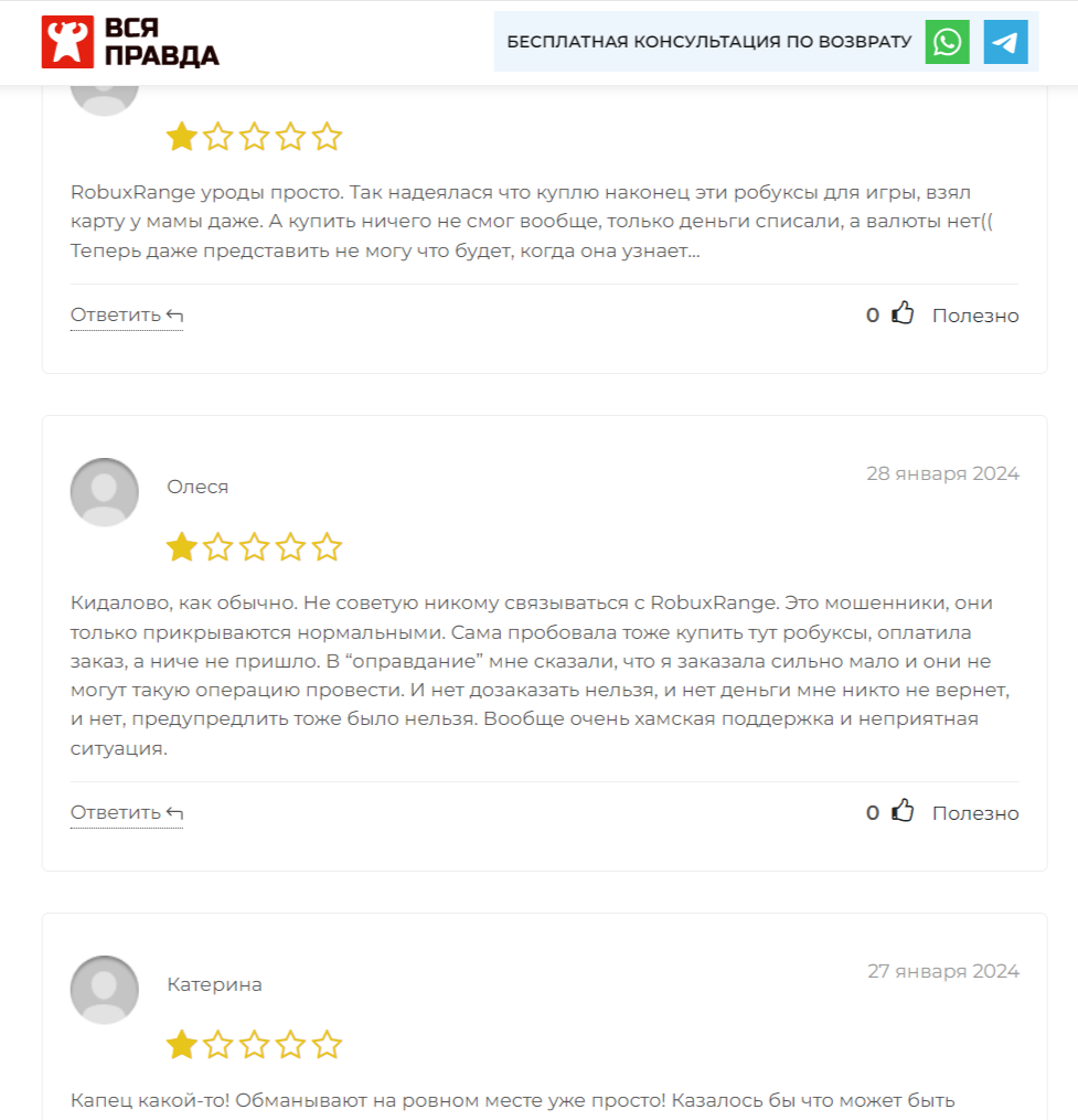 Почитатели Roblox знают, как важно иметь возможность приобретать Робуксы — игровую валюту, которая делает игру поистине увлекательной. Мы разделяем это мнение и понимаем, насколько ответственно следует выбирать надежные сайты для покупки. Поэтому специально для вас собрали отзывы о сайтах, где можно купить Робуксы, и выяснили, где делать это не стоит. Для сравнения мы взяли несколько сайтов и вот что нашли: Об этом сайте игроки на форумах оставляют только негативные комментарии, сообщая, что сервис зарабатывает на подписчиках не честным путем. Вот что еще пишут пользователи на сайте “Стоп ворам”: “На платформе указан контактный адрес электронной почты. Но, как показала проверка, он не соответствует действительности”. Кроме этого, несмотря на наличие собственного сайта, судя по комментариям, обмен Робукcов на деньги проходит в социальной сети VK. Почему-то продавец предпочитает общаться с клиентами только через социальную сеть ВКонтакте. Мы решили лично проверить сайт, но зайти на него