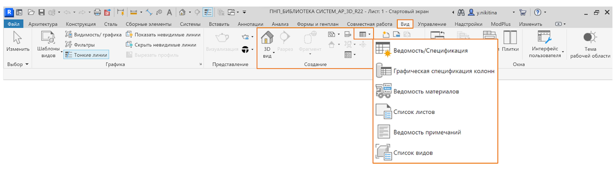 Поскольку спецификация — это вид, инструмент для ее создания находится на панели управления в разделе «Вид» – «Создание»