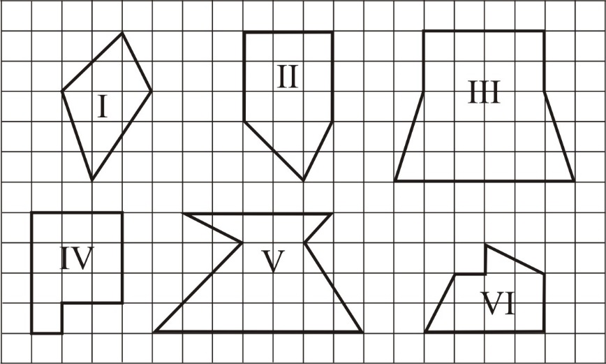 ПСФ1-01 Найдите площадь каждого изображенного многоугольника. При рассмотрении фигур III, V и VI предложите 2 способа. Длину стороны клетки считать равной единице.