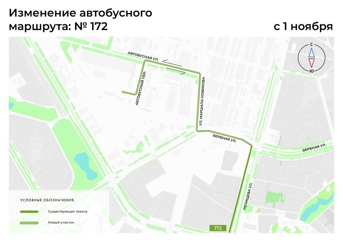 В Петербурге с 1 ноября меняется трасса автобусного маршрута №172 «Автобусный парк №2 – Шуваловский проспект», сообщили сегодня в пресс-службе «Организатора перевозок». Так, маршрут в прямом направлении – Автобусный переулок, Автобусная улица, улица Маршала Новикова, Вербная улица, Репищева улица и по действующей трассе, в обратном – по действующей трассе до Репищевой улицы, Вербная улица, улица Маршала Новикова, Автобусная улица, Автобусный переулок. Ранее «Петербургский дневник» сообщал, что в Петербурге 1 ноября переименовываются остановочные пункты на автобусных и троллейбусных маршрутах.