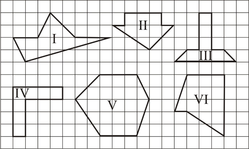 Найдите площадь каждого изображенного многоугольника. При рассмотрении фигур III, V и VI предложите 2 способа. Длину стороны клетки считать равной единице.