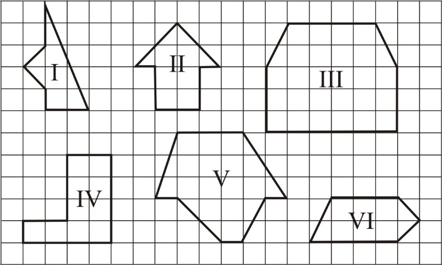 Найдите площадь каждого изображенного многоугольника. При рассмотрении фигур II, III и VI предложите 2 способа. Длину стороны клетки считать равной единице.