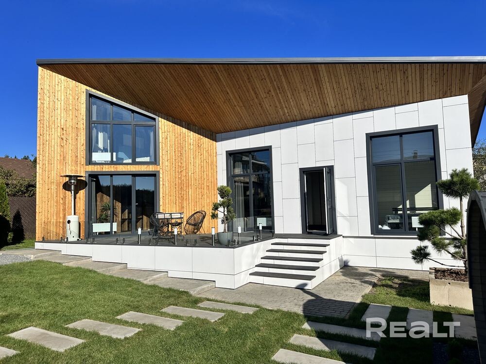 В 2 км от МКАД, в СТ с респектабельной застройкой продается новый дом с оригинальной архитектурой и свежим стильным интерьером. Готов к проживанию – есть мебель и современная техника. На участке с ландшафтным дизайном установлены мини-баня и бассейн. Узнали стоимость. Дом находится в СТ «Заценьский Родник» – это всего 2 километра до Минска. Дом новый, построен по оригинальному архитектурному проекту: панорамное остекление, отдельная комната под односкатной крышей, второй свет. В отделке фасада использовался деревянный планкен и серая плитка. Со стороны двора примыкает большая терраса. Общая площадь 120 квадратов. В доме просторная кухня-гостиная с камином, витражным остеклением и вторым светом. На первом уровне расположены две спальни и большой санузел. Из гостиной на второй уровень ведет стильная лестница с деревянными ступенями. Там находится большая мастер-спальня с окнами в пол и стеклянными перегородками. Интерьер современный, светлый, наполнен стильной и со вкусом подобранной меб