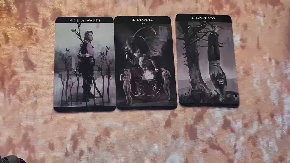 Давайте посмотрим, что нам расскажут карты. Какую ситуацию они нам откроют? Вот девятка жезлов. О, здесь речь пойдёт о манипуляциях и зависаниях. Возможно, кто-то столкнулся с магическим воздействием и изо всех сил старается сохранить спокойствие. В этой ситуации есть роковые страсти и связи, которые вы не можете разорвать. Возможно, вы уже думали о том, чтобы уйти из этих отношений, но что-то вас удерживает. Вы чувствуете себя жертвой в этих отношениях из-за семьи, чувств и любви. Вы, как королева жезлов, стоите на страже, защищаете свою семью. В этой ситуации всё про королеву жезлов — яркую, страстную стихию огня и мужчину, который не может определиться. Рыцарь Пентаклей. Если честно, вы как будто застряли в этих отношениях. Мужчина смотрит куда-то в сторону, как будто хочет уйти. Он не может нести обязательства, ему нужно, чтобы его не нагружали. Он начинает нервничать и злиться, и сейчас это особенно заметно. Он испытывает гнев, но не может понять почему. Возможно, это связано с е