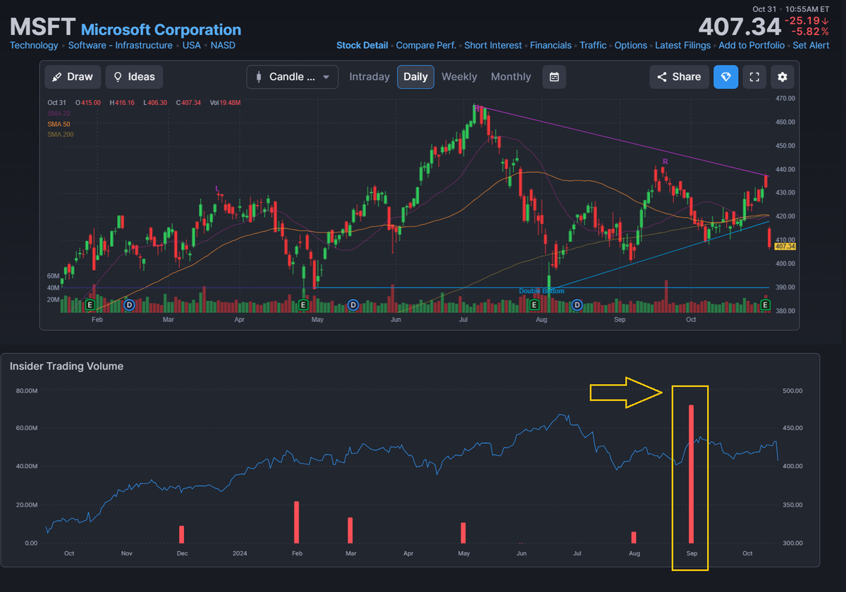 🔻Акции Microsoft (MSFT) упали более чем на 5%, несмотря на сообщение о более высокой, чем ожидалось, прибыли на акцию в первом квартале, На графике я выделил столбик, когда еще в сентябре начали продавать акции инсайдеры. ❗️Если вы научитесь находить эту информацию, то вы также будете знать наперед, что может произойти с акцией! ❗️Все инвест-идеи на моем канале: https://t.me/milcapital