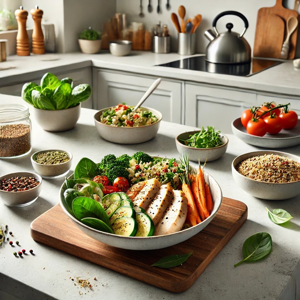 - Пример меню: овощной суп, каша с орехами, салат с курицей.