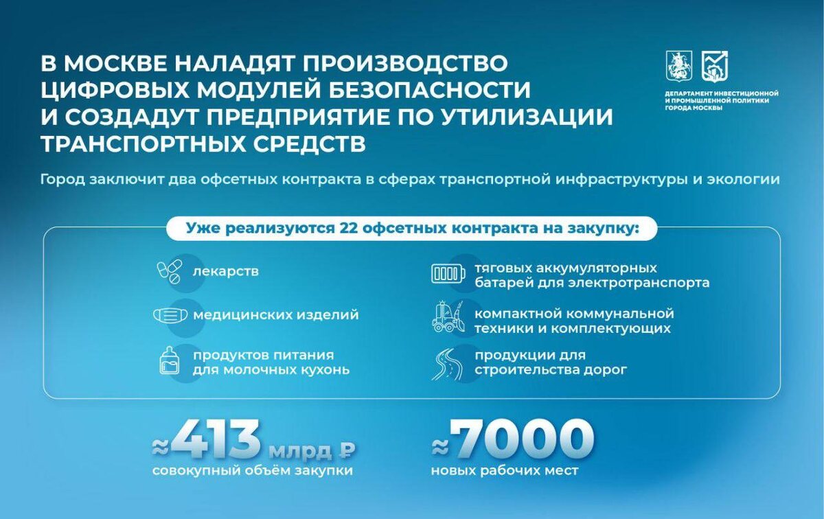 🔵Один на производство SAM-модулей для устройств оплаты проезда в городском транспорте. Электронные изделия будут обеспечивать безопасность хранения информации на проездных билетах «Тройка» и транзакций по ним. 🔵Второй на утилизацию вышедших из эксплуатации транспортных средств и отработанных запчастей. Это также поможет гарантировать экологически безопасную переработку технических жидкостей, тяжёлых металлов и других химических отходов. Исполнители будут определены по итогам конкурса. С 2017 года город заключил 22 офсетных контракта на поставку лекарств, медизделий, продуктов питания для молочных кухонь и многого другого. По восьми из них инвесторы уже создали производства и начали поставки продукции, — написал Сергей Собянин в своем телеграм-канале.