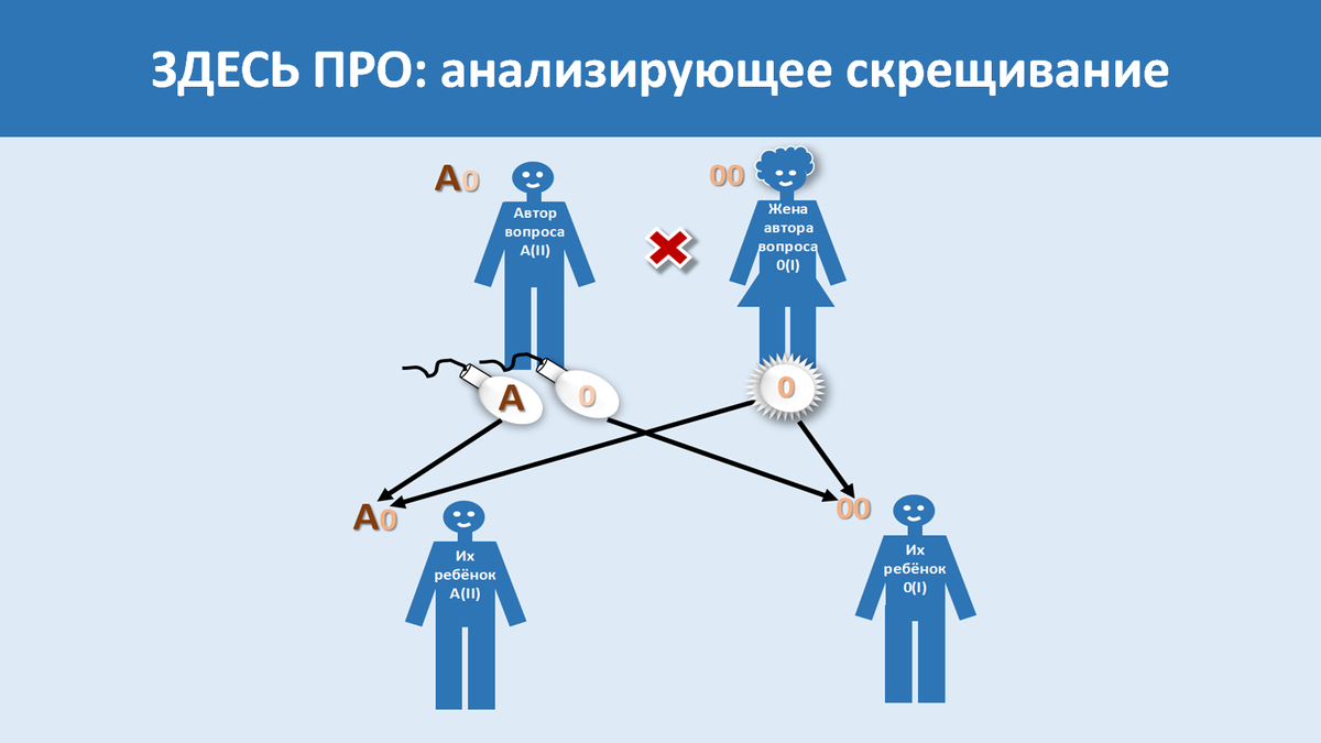 Объясняю на конкретном примере. Конкретный пример - это мой ответ на вопрос читателя. "а как узнать свой генотип? У меня А (||) группа, но 0 или А не знаю. Где такое узнать? У матери В, у отца А. У меня А, у брата В" женитесь на женщине с 0 (I) группой и проведите с нею анализирующее скрещивание, в результате которого у вас появятся дети. Если все они будут иметь группу А (II), то ваш генотип АА. если хотя бы кто-то из них будет иметь группу 0 (I), то ваш генотип А0. Одно уточнение: для достоверности результата эксперимента детей должно быть статистически значимое количество (хотя бы 100). Но это только если рождаться будут один за другим с группой А (II). А вот как только родится с группой 0 (I), эксперимент можно закрывать и быть уверенным, что ваш генотип А0. 😊 анализирующее скрещивание - это скрещивание организма с доминантным фенотипом и неизвестным генотипом с особью, имеющей рецессивный фенотип и следовательно рецессивный же и генотип При этом есть два варианта пос